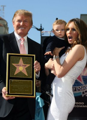 На фото: Дональд Трамп, его жена Меланья и сын во время открытия звезды Дональда Трампа на аллее славы в Голливуде, США, 2007 год.20 марта 2006 года у пары родился мальчик, которого назвали Бэррон Уильям Трамп. Он стал пятым ребенком Дональда Трампа.