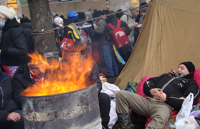 А пока все было «як у Європі». Весело грелись у костров. По ночам отмывали сажу под горячим душем гостеприимных киевских квартир. Отдыхали в Киевраде, Национальной консерватории, Октябрьском дворце и других ведомственных зданиях, захваченных вокруг Крещатика. Удивительно, что даже в самые лютые морозы «кровавый Янукович» не решился отключить там отопление.