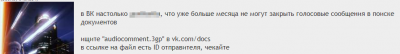 В публикации говорится, что проблема существует уже больше месяца. Найти личные аудио-сообщения других людей можно, совершив поиск по имени файла audiocomment.3gp. Также по ссылке на файл можно установить идентификатор страницы автора сообщения.