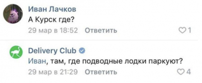 Сотрудник компании по доставке еды Delivery Club посмеялся над утонувшей в 2000 году подлодкой К-141 "Курск", отвечая на вопросы пользователей "ВКонтакте".