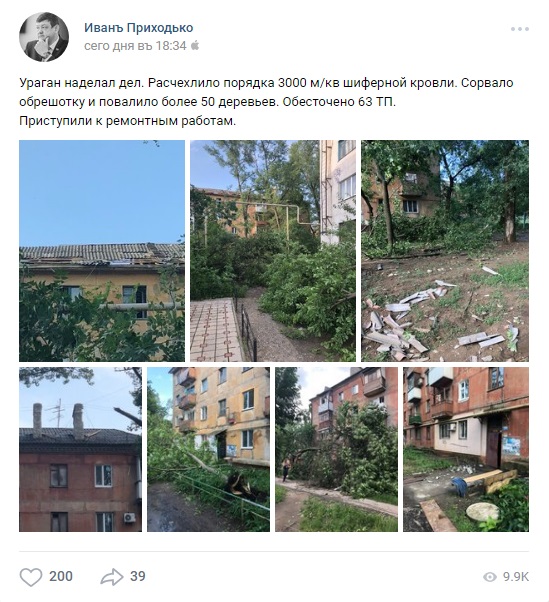 В среду, 6 июня в Горловке прошел ураган. Руководитель городской администрации Иван Приходько сообщил, что ураган сорвал более 3000 метров квадратных шиферной кровли.