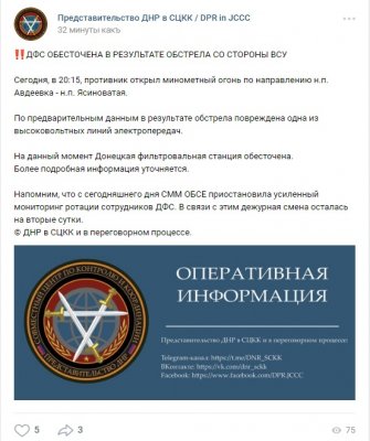 В результате очередного обстрела со стороны ВСУ вновь обесточена Донецкая фильтровальная станция, сообщает представительство ДНР в СЦКК.