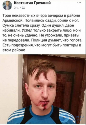 «Сумка слетела сразу. Один душил, двое избивали. Успел только закрыть лицо, но и то, не очень удачно. Не угрожали, приветы не передавали. Полиция думает, что гопота», — пишет Гречаный.