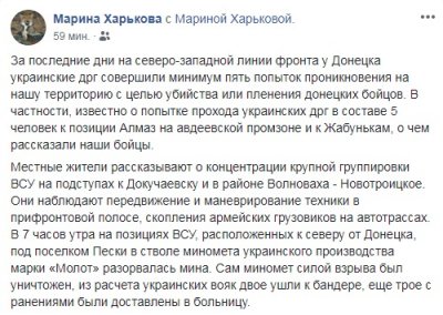 «За последние дни на северо-западной линии фронта у Донецка украинские дрг совершили минимум пять попыток проникновения на нашу территорию с целью убийства или пленения донецких бойцов. В частности, известно о попытке прохода украинских дрг в составе 5 человек к позиции Алмаз на авдеевской промзоне и к Жабунькам, о чем рассказали наши бойцы», — написала она на своей странице в Facebook.