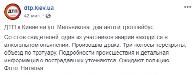 Один из украинских Telegram-каналов сообщает о столкновении двух автомобилей и троллейбуса. По сведениям очевидцев, один из участников происшествия находился в алкогольном опьянении.