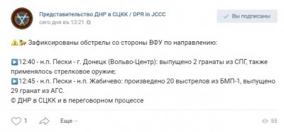 «Зафиксирован обстрел со стороны вооруженных формирований Украины в 12:45 по направлению Пески – Жабичево. Произведено 20 выстрелов из БМП – 1 и выпущено 29 гранат из АГС», – сказано в сообщении.