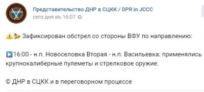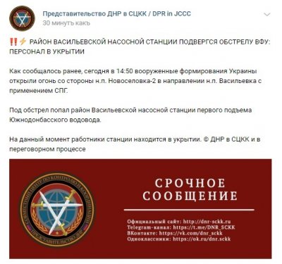 Сегодня днем украинские вооруженные формирования открыли огонь по н.п. Васильевка. Под обстрел попал район Васильевской насосной станции первого подъема Южнодонбасского водовода, сообщает представительство ДНР в СЦКК.