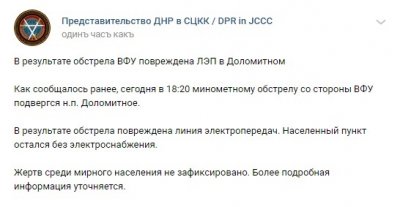 «Сегодня в 18:20 минометному обстрелу со стороны ВФУ подвергся н.п. Доломитное. В результате обстрела повреждена линия электропередач. Населенный пункт остался без электроснабжения», — говорится в сообщении.