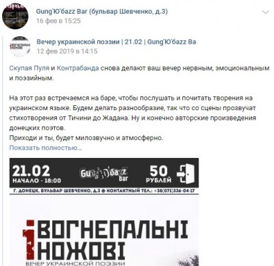 В известном донецком баре Gung’Ю’бazz был организован вечер украинской поэзии — среди авторов также был указан активный участник харьковского «майдана», пособник украинских карателей, поэт Жадан.