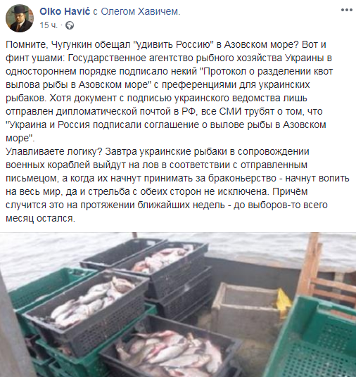 Улавливаете логику? Завтра украинские рыбаки в сопровождении военных кораблей выйдут на лов в соответствии с отправленным письмецом, а когда их начнут принимать за браконьерство – начнут вопить на весь мир, да и стрельба с обеих сторон не исключена. Причём случится это на протяжении ближайших недель – до выборов-то всего месяц остался», — написал политолог на своей странице в Facebook.