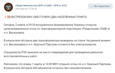В субботу, 2 марта, украинские вооруженные формирования нанесли прицельный удар по трансформаторной подстанции «Раздольная» 35кВт. В результате обстрела два поселка остались без света, сообщает представительство ДНР в СЦКК.
