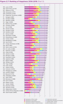 В пятерку «самых счастливых в стран» вошли Финляндия, Дания, Норвегия, Исландия и Нидерланды. Россия в этом рейтинге заняла 68 место. Украина расположилась на 133 месте между Чадом (132-е) и Эфиопией (134-е).