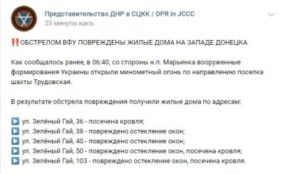 В ведомстве добавили, что позднее, с 07:25 до 07:55 украинскими боевиками снова был произведен обстрел поселка шахты Трудовская на западе столицы ДНР. Противник использовал при обстреле минометы калибром 120 мм, выпущено 12 мин. Огонь велся из оккупированного ВСУ населенного пункта Марьинка.