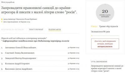 Автор петиции Максимчук выступил за введение «санкций в области правописания» в отношении «агрессора». В частности, он предлагает писать слово «Россия» со строчной буквы.