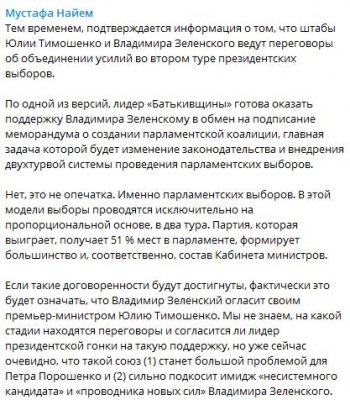 «Тем временем, подтверждается информация о том, что штабы Юлии Тимошенко и Владимира Зеленского ведут переговоры об объединении усилий во втором туре президентских выборов». — пишет он.