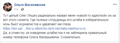 Скандал разгорелся после того, как Василевская обнародовала номер мобильного телефона Ляшко. После этой ситуации украинский «радикал» на своей странице в Facebook в ответ опубликовал телефонные номера кандидата в президенты Украины Зеленского и украинского олигарха Коломойского. При этом Зеленский написал, что «какая-то идиотка с «1+1» слила» его личный номер в сеть.