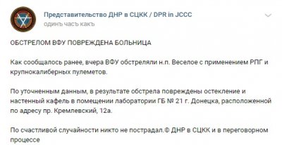 В результате обстрела получило повреждение здание одной из больниц под Донецком.