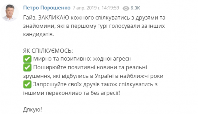 Действующий президент Украины Порошенко в своем Telegram-канале призвал украинскую молодежь общаться с друзьями и знакомыми, которые в первом туре президентских выборов голосовали за других кандидатов, и рассказывать им «о прошедших за последние пять лет положительных изменениях».