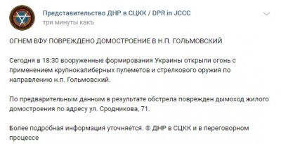 «Сегодня в 18:30 вооруженные формирования Украины открыли огонь с применением крупнокалиберных пулеметов и стрелкового оружия по направлению н.п. Гольмовский. По предварительным данным в результате обстрела поврежден дымоход жилого домостроения по адресу ул. Сродникова, 71», — сказано в сообщении.