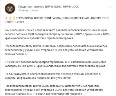 Украинские вооруженные формирования второй раз за день обстреляли район Васильевской насосной станции в ДНР, сообщает представительство Республики в СЦКК.
