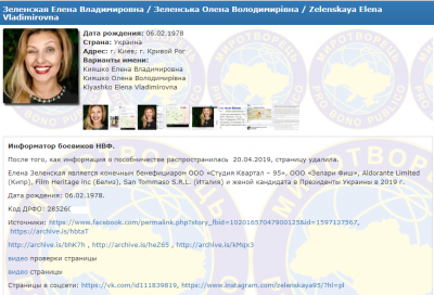 20 апреля на скандальный сайт «Миротворец» внесли жену украинского комика, шоумена и кандидата в президенты Зеленского Елену. Причина, по которой она попала на сайт — «информатор боевиков». Об этом говорится в описании на сайте.