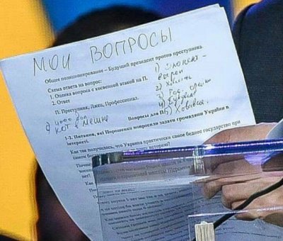 Спецкор «Комсомольской правды» Дмитрий Смирнов опубликовал фото, где виден текст на шпаргалке украинского комика, шоумена и кандидата в президенты Украины Зеленского, которую он использовал во время дебатов с действующим президентом страны Порошенко.