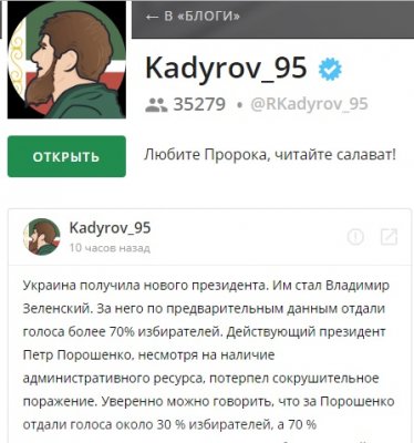 «…Не берусь предсказывать, из какой команды Зеленский. Это не является большим секретом. Но у него есть огромное преимущество перед Порошенко — мандат доверия, пусть и протестного характера, возможность одуматься, осознать, что Россия самый близкий сосед, Россия — страна, которая первой протянет руку помощи в дни невзгод, Россия рядом, а те, кто, расталкивая всех локтями, рвутся в друзья, находятся за тридевять земель. Хочется пожелать Владимиру Зеленскому удачи в благородных делах, направленных на возрождение Украины и единение украинского и российского народов. Если такие намерения у него появятся», — написал Кадыров.