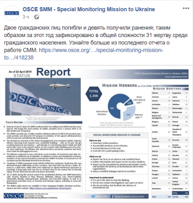 На территории военной операции украинских войск против жителей Донбасса с начала года погиб 31 мирный житель. Об этом говорится в отчете Специальной мониторинговой миссии (СММ) ОБСЕ, опубликованном сегодня в Facebook, 25 апреля.