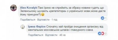 «Сначала пусть пройдет очищение организма от ментальных московских шлаков и гламурного совка», – ответила на это Фарион.