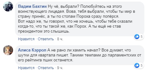 «А не рано ли хамить начал? Все думает, что шутки для квартала пишет. Такими темпами до парламентских от его рейтинга пшик останется».