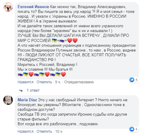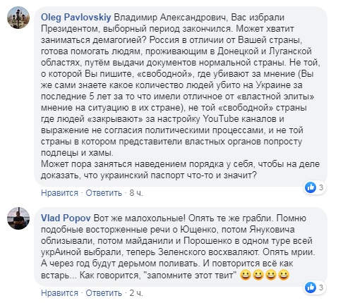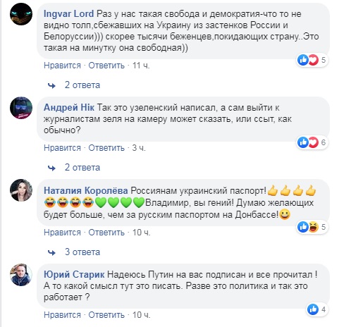 Пост комика Зеленского, в котором будущий президент Украины прокомментировал инициативу президента РФ Владимира Путина о выдаче паспортов жителям Донбасса и Украины и назвал свои условия нормализации отношений с Россией, собрал тысячи комментариев пользователей Facebook.