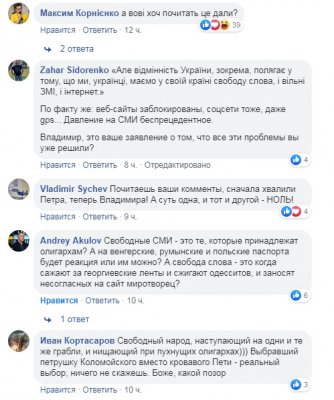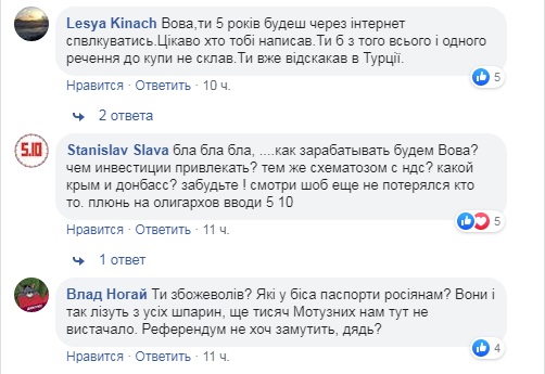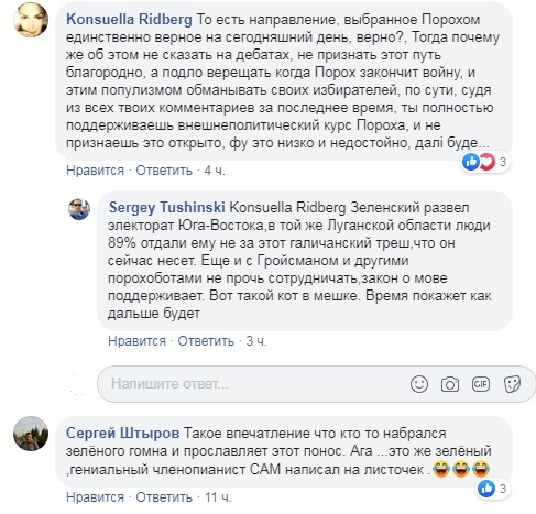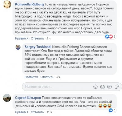 «То есть направление, выбранное Порохом единственно верное на сегодняшний день, верно?, Тогда почему же об этом не сказать на дебатах, не признать этот путь благородно, а подло верещать когда Порох закончит войну, и этим популизмом обманывать своих избирателей, по сути, судя из всех твоих комментариев за последнее время, ты полностью поддерживаешь внешнеполитический курс Пороха, и не признаешь это открыто, фу это низко и недостойно, далi буде…».