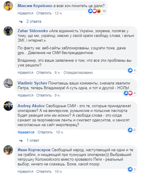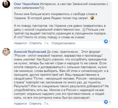 Большинство комментаторов критично восприняли обращение Зеленского, обвинив его во вранье и переходе на воинствующую риторику уходящего президента Порошенко. ИА «Новороссия» публикует часть комментариев для понимания общей картины восприятия заявления Зеленского теми избирателями, которые видели в нем альтернативу Порошенко.