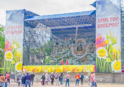 На центральной сцене парка проходит традиционный праздничный концерт «Пасха – светлая! Пасха – красная!» с участием творческих коллективов города. Под заводные песни и танцы гости праздника имеют возможность посетить множество праздничных секторов и сделать необычное селфи: на фоне декоративных «пасхальных кроликов», «пасхальных яйц и деревьев», установленных перед каскадными фонтанами.