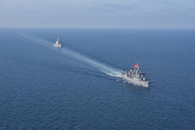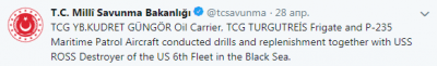 «Эсминец 6-го флота США USS Ross, военные корабли ВМС Турции: нефтетанкер TCG YB.KudretGungor, фрегат TCG Turgutreisи морской патрульный самолет P-235 провели учения в Черном море», – сказано в сообщении.