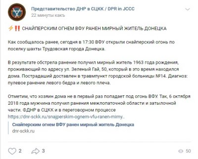 По данным ведомства, в 17:30 ВСУ открыли снайперский огонь по поселку шахты Трудовская города Донецка.