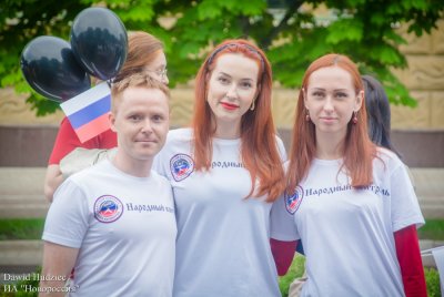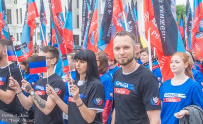 Они несли в руках транспаранты, огромное количество флагов ДНР и России, запускали в небо воздушные шары.