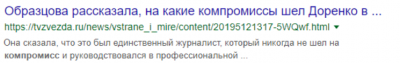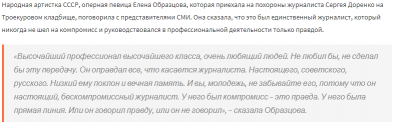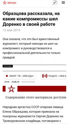 На сайте телеканала появился материал под заголовком "Образцова рассказала, на какие компромиссы шел Доренко в своей работе". В тексте новости привели слова покойной певицы о скончавшемся несколько дней назад журналисте: "Низкий ему поклон и вечная память".