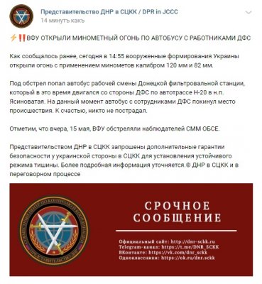 «В 14:55 вооруженные формирования Украины открыли огонь с применением минометов калибром 120 мм и 82 мм. Под обстрел попал автобус рабочей смены Донецкой фильтровальной станции, который в это время двигался со стороны ДФС по автотрассе Н-20 в н.п. Ясиноватая. На данный момент автобус с сотрудниками ДФС покинул место происшествия. К счастью, никто не пострадал», — сказано в сообщении.
