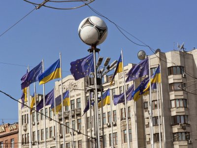 Для установки символа оккупации на Европейской площади коммунальные службы демонтировали футбольный мяч, установленный накануне чемпионата Европы 2012 года.