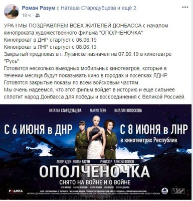 «Мы поздравляем всех жителей Донбасса с началом кинопроката художественного фильма «Ополченочка». Кинопрокат в ДНР стартует с 06.06.19, кинопрокат в ЛНР стартует с 08.06.19», — написал он на своей странице в Facebook.