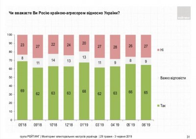 Согласно опросу, проведенному социологической группой Рейтинг, 65% жителей Украины считают Россию агрессором, 27% — так не считают. При этом более 60% опрошенных выступают за дипломатические пути урегулирования в Донбассе (38% — за прекращение военных действий и замораживание конфликта, 22% — за предоставление этим территориям самостоятельного или федеративного статуса в составе Украины).
