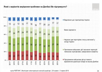 Только 5% — за полное отделение оккупированных земель. С другой стороны, 18% поддерживают продолжение военных действий до полного восстановления украинской власти по всей территории Донбасса.