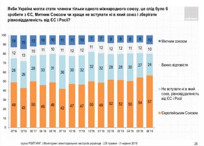 «Поддержка прозападного вектора в дальнейшем преобладает: 62% — за вступление Украины в Европейский союз (22% — против), 53% — в НАТО (31% — против). При выборе нескольких векторов экономической интеграции — 57% за вступление в ЕС, 24% — за равноудаленность от России и Запада, 10% — за вступление в Таможенный союз», — говорится в сообщении.