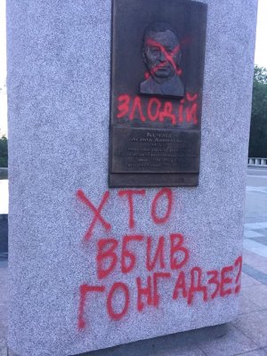 Ниже барельефа хулиганы нанесли надпись: «Кто убил Гонгадзе?».