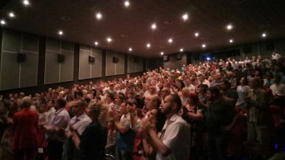 В зале кинотеатра «Русь» на премьере яблоку негде было упасть. Организаторам пришлось размещать всех желающих на дополнительных приставных стульях.