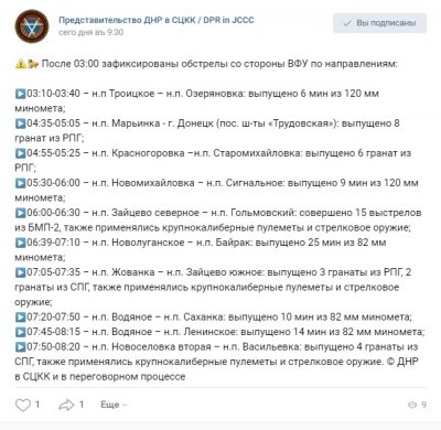 Представительство Республики в СЦКК также зафиксировало обстрелы, начавшиеся после 3:00 9 июня.