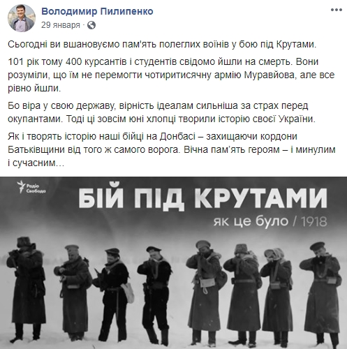 Как и творят историю наши бойцы на Донбассе — защищая границы Родины от того же врага. Вечная память героям — и прошлым и настоящим…», — также написал депутат в годовщину боя под Крутами.
