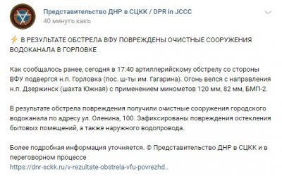 В результате минометного обстрела со стороны ВСУ в прифронтовой Горловке получили повреждения очистные сооружение горводоканала, сообщает представительство ЛДНР в СЦКК.