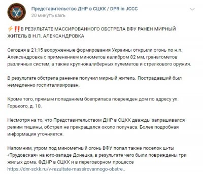 Украинские вооруженные формирования обстреляли пригород Донецка. В результате обстрела был ранен мирный житель, сообщает представительство ДНР в СЦКК.